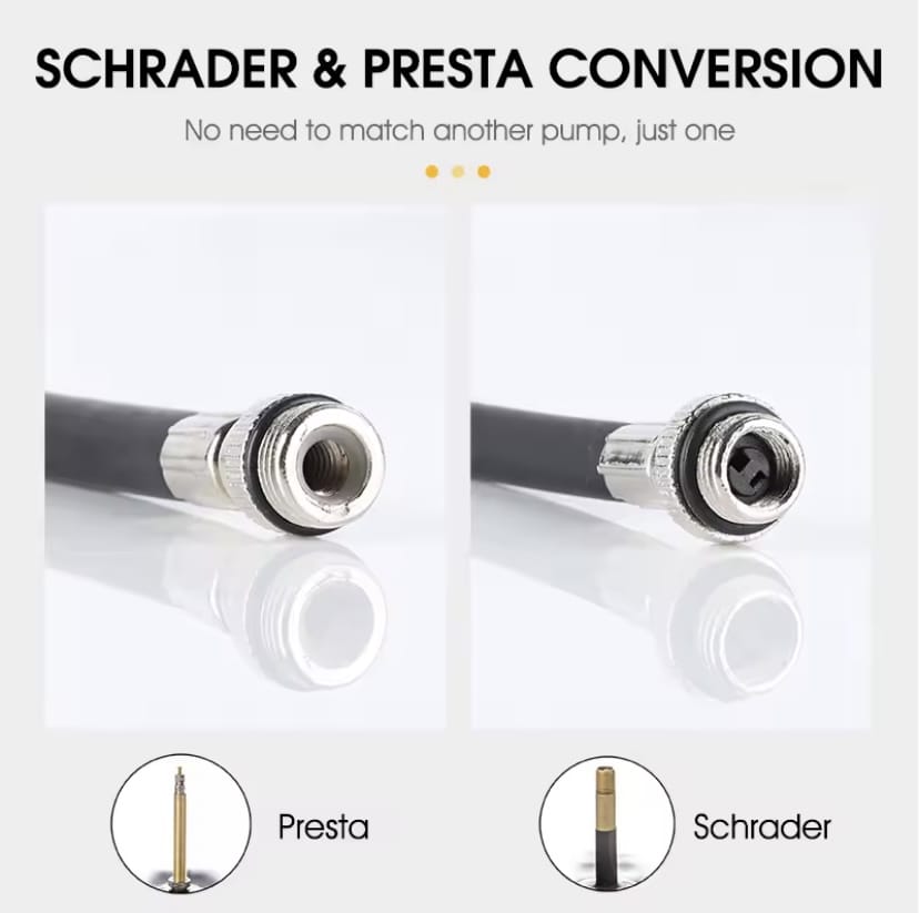 š§ Dual Valve Head ā Compatible with Presta & Schrader valves without adapters.