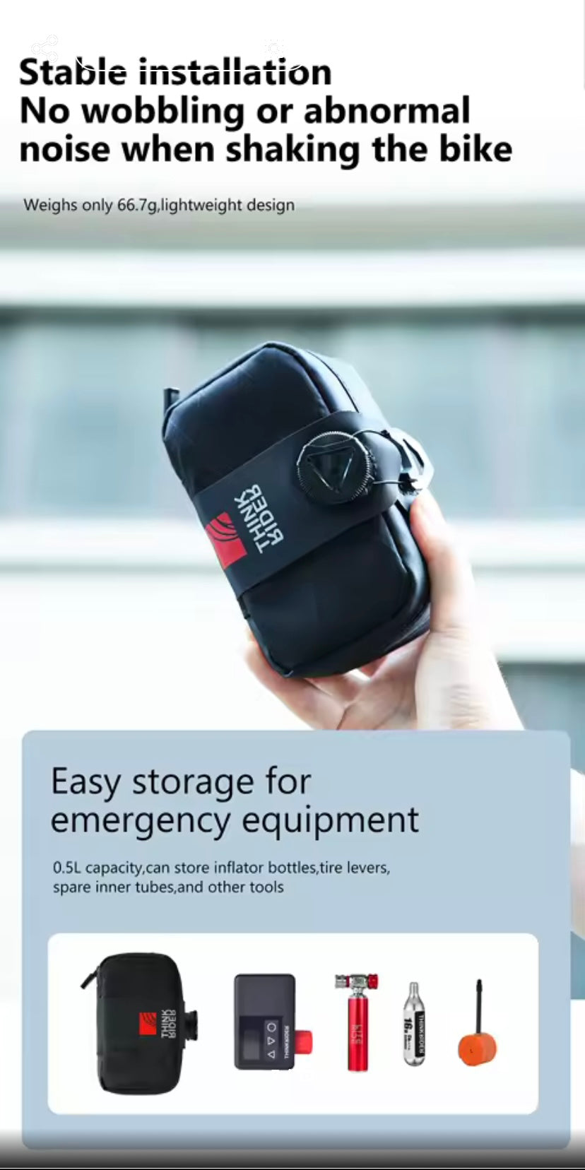 Experience stable and noise-free rides with the THINKRIDER Lightweight Saddle Bag, engineered for cyclists who value practicality and performance. This compact bag offers a secure and wobble-free installation, even when the bike is shaking. Weighing only 66.7 grams, it provides a minimalist, aerodynamic design without compromising on storage space for essentials like tools, tubes, or keys. Perfect for road, gravel, and mountain bikes — combining durability, style, and functionality in one sleek package.